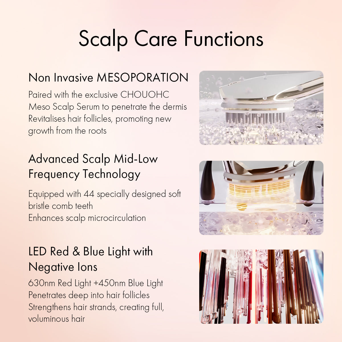Developed with advanced Japanese salon technology, CHOUCHOU TOKYO Mesobrush combines 4 core technologies to improve the health and vitality of your scalp and hair roots.