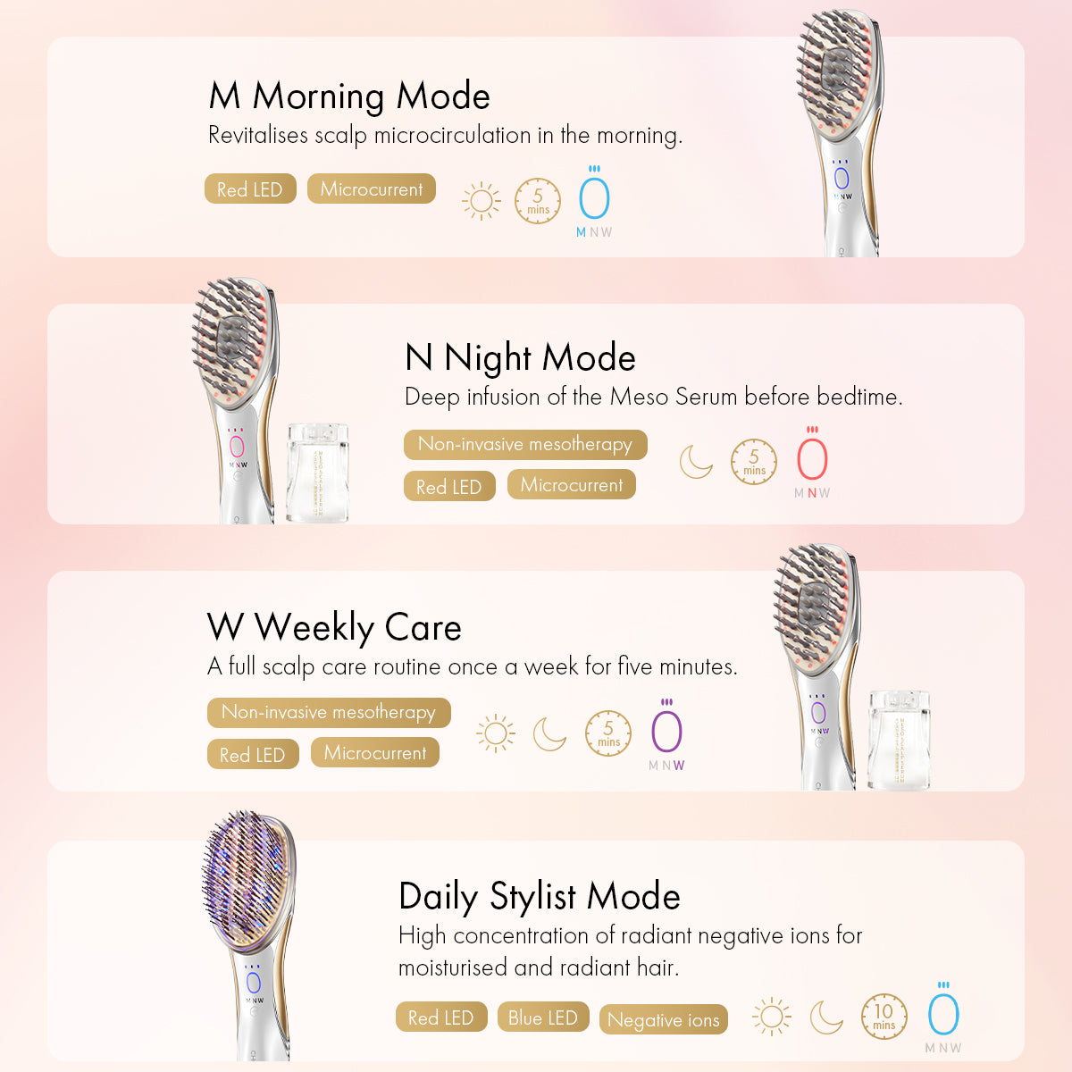 5-minute N (Night) Mode and W (Weekly) Mode: Use with scalp essence to improve follicle environment.